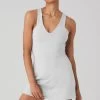 Fashion-forward and beyond functional, the Courtside is made of super soft, stretchy Alosoft with thin adjustable straps, a sweetheart neckline, a snug fit through the waist, and a mini-length A-line skirt. Bonus points for the hidden shelf bra and shorts. Just add a racquet and sneakers (for on the court) or sandals and a mini bag (for off the court).