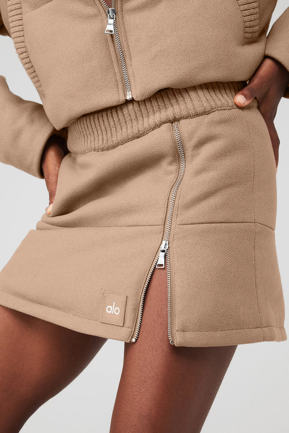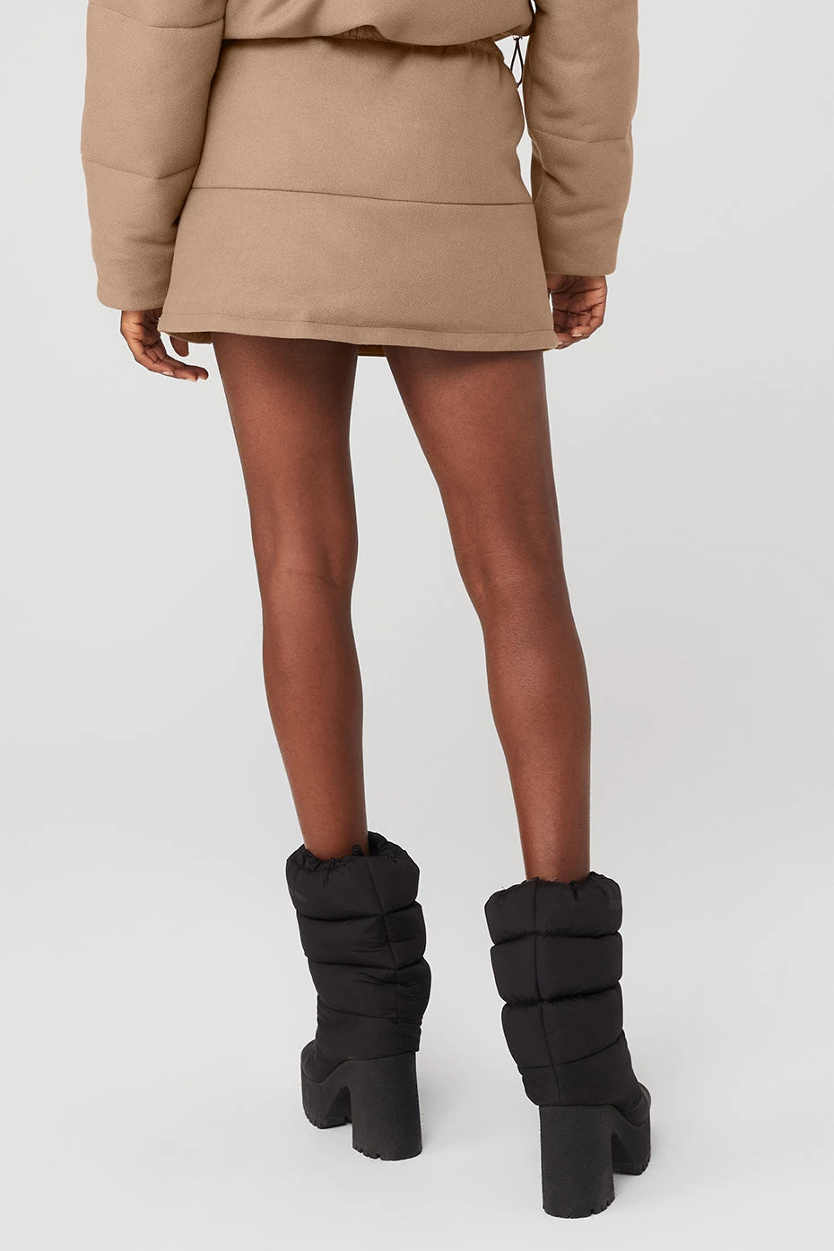 The Polaris Puffer Skirt brings an unexpected, ultra-forward silhouette to après-ski. This high-rise mini hits at mid thigh and features a sweater-ribbed waistband that sits comfortably at the waist. It’s made from luxe, ultra-warm wool puffer fabric and features a functional zipper opening for custom slit styling. Pair with the Polaris Puffer Jacket for the full look.