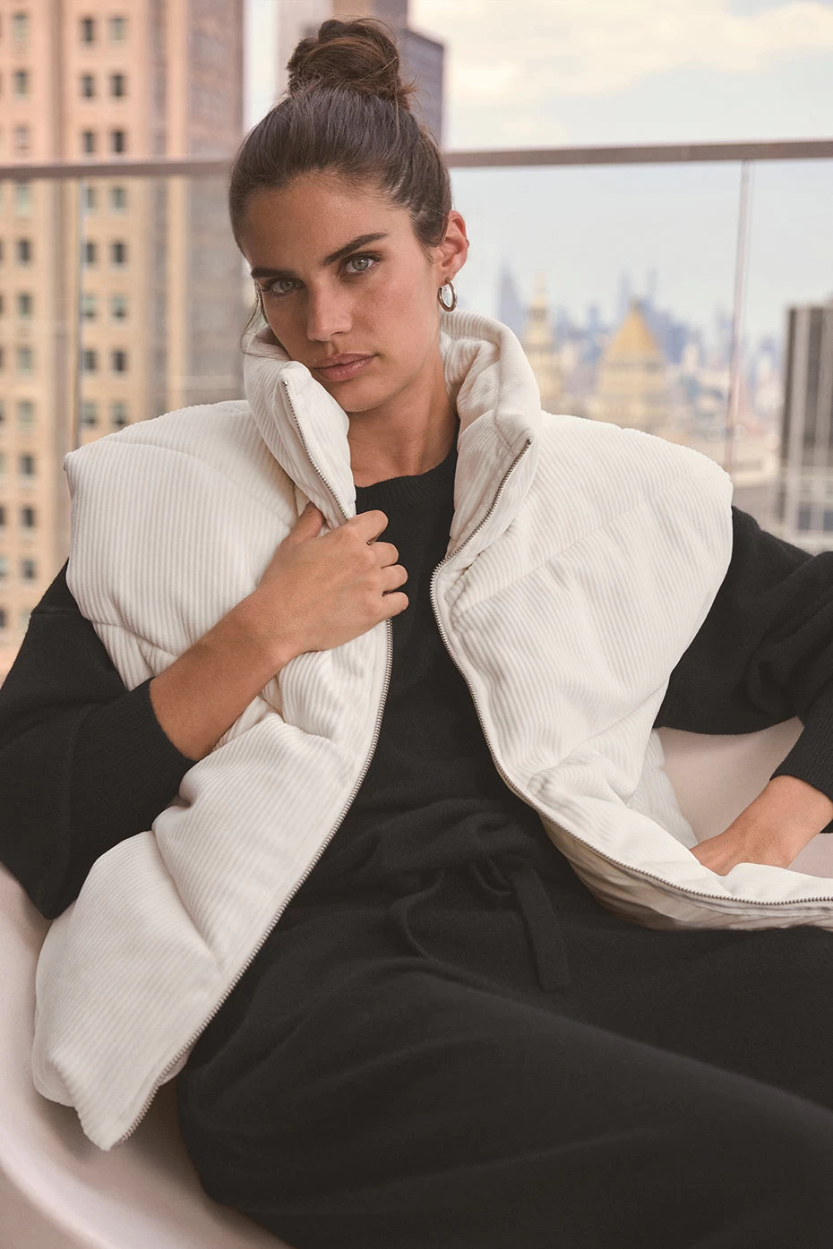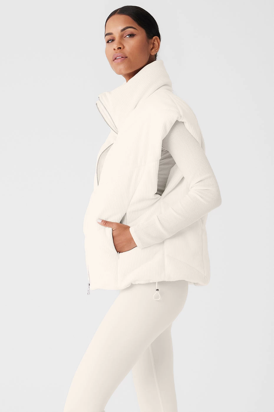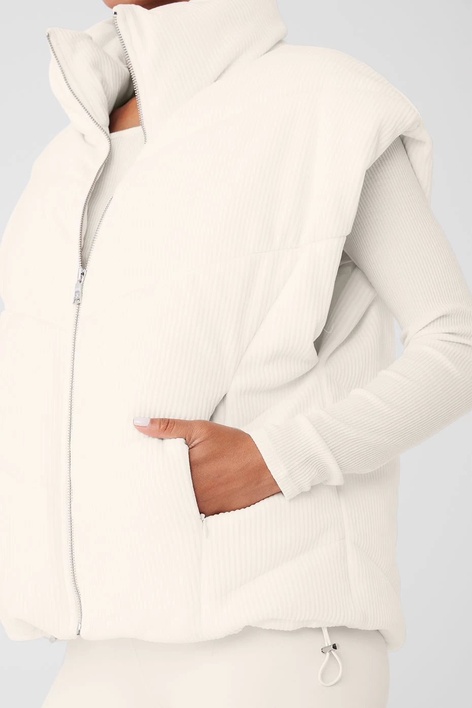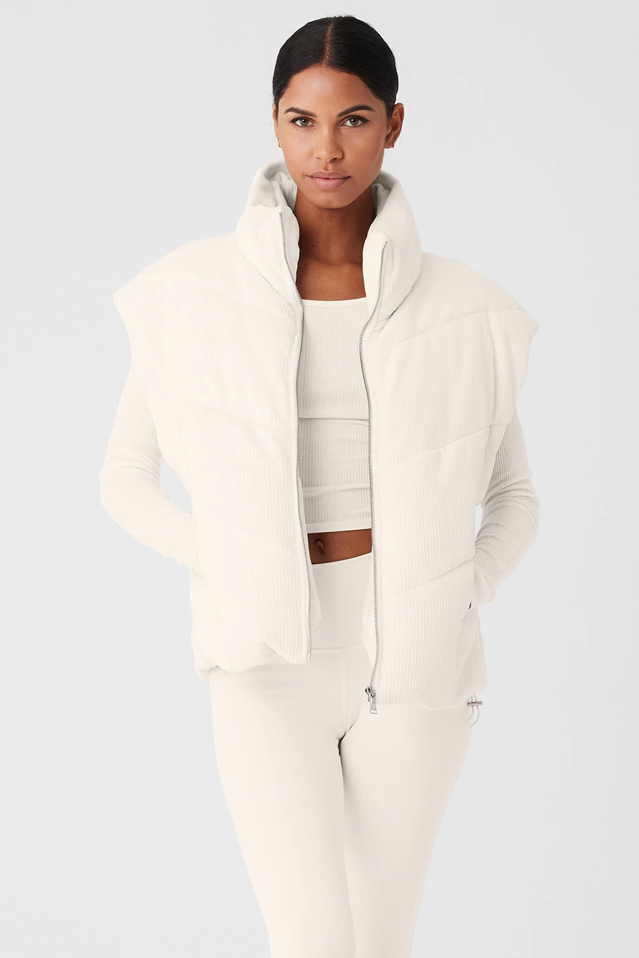 - Ribbed velour puffer vest with cinched waist