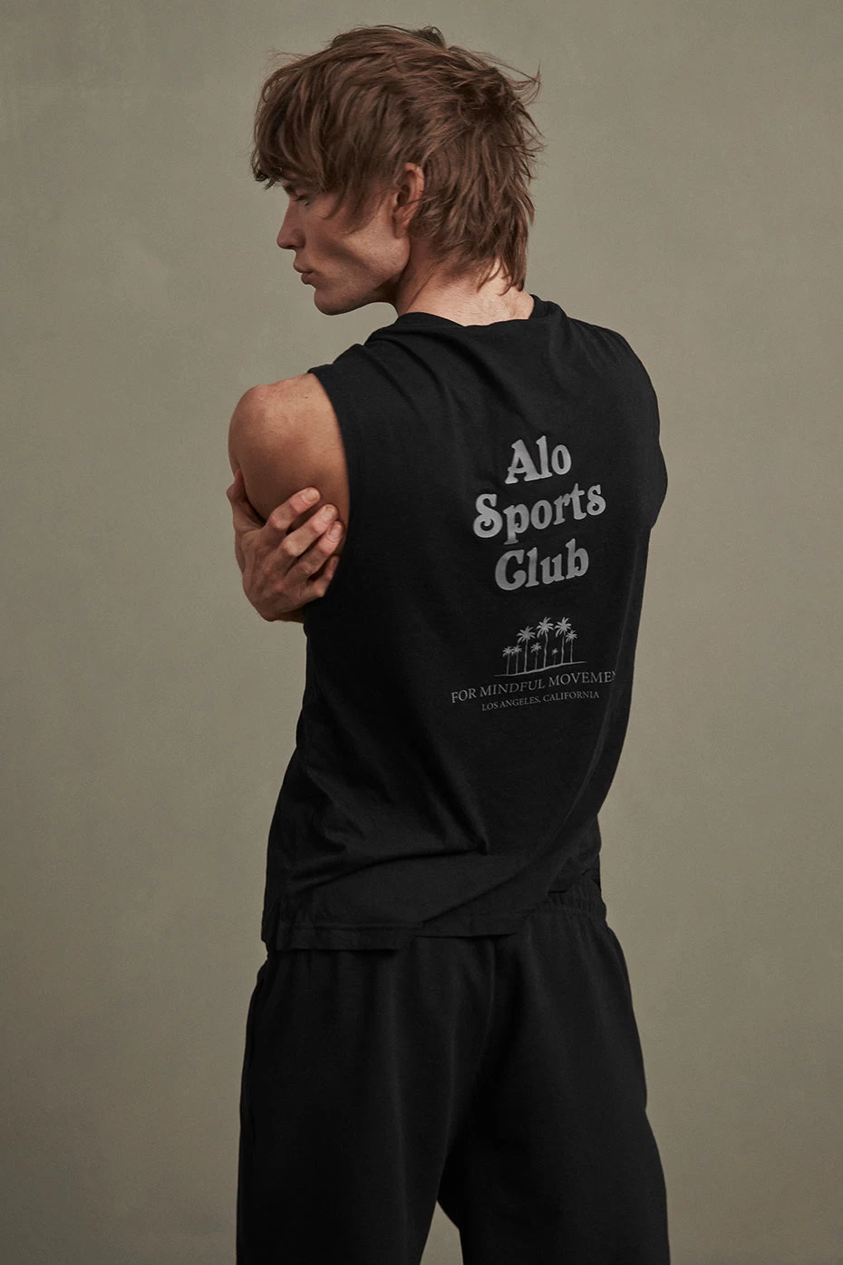 The Sports Club Palms Muscle Tank takes the softest jersey fabric in the game and adds an iconic Alo Sports Club logo for a graphic top to wear year-round. With relaxed dropped armholes and neckline plus a regular fit, take this instant classic from workout to wear-out. Pair it up with the Sports Club Palms Chill Short for a casual, streetwear go-to.