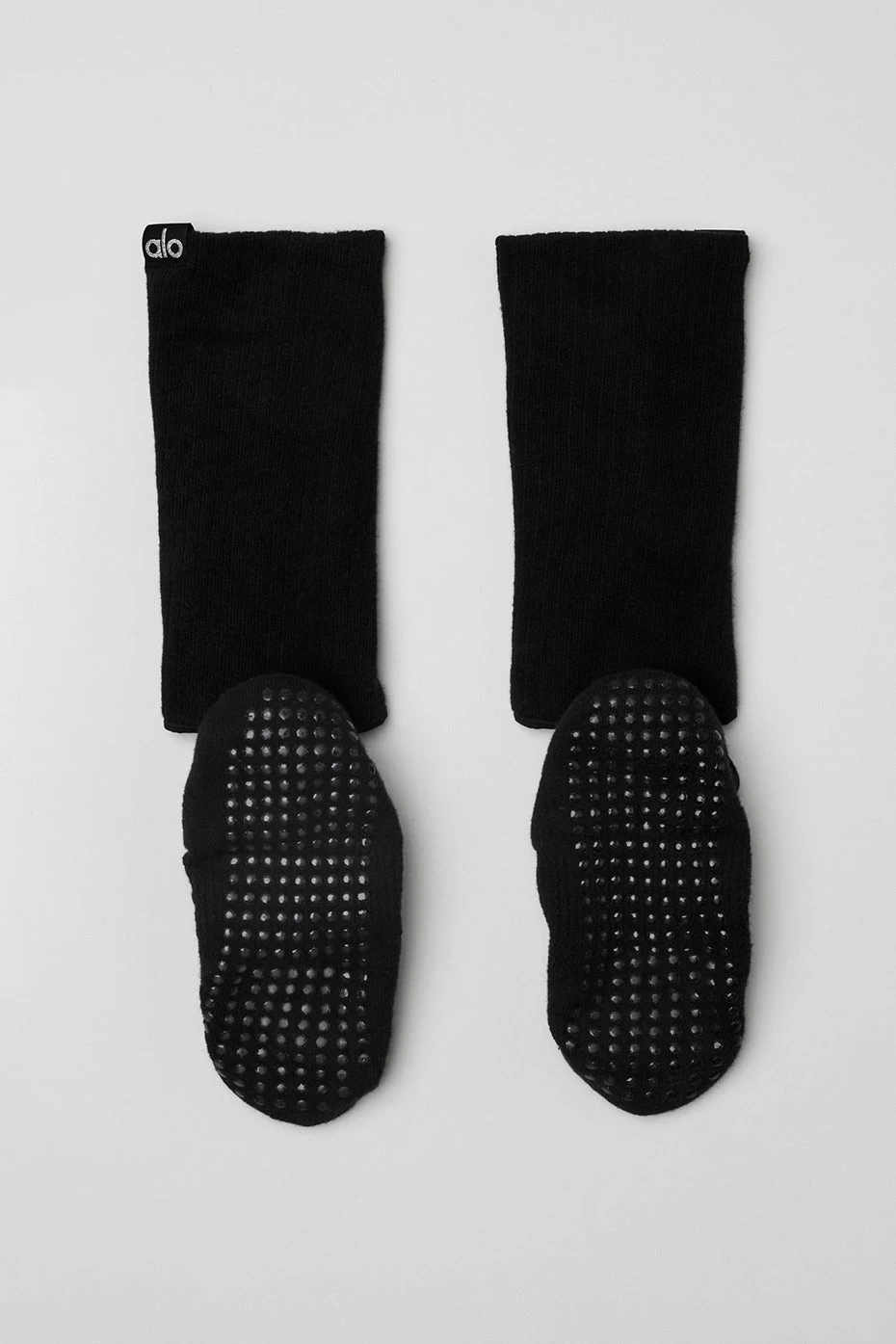 A studio class essential, this crew-length barre sock features cushioned soles with no-slip silicone grips, elastic cross-strap details and ribbed ankle cuffs.